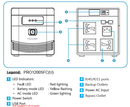 Dòng sản phẩm PROLINK SFC là hệ thống UPS Line Interactive vào 1 pha/ra 1 pha sử dụng Công nghệ nạp sạc siêu nhanh. Công nghệ có lợi thế vượt trội này có thể nạp sạc lại cho Ăc quy dự phòng 90% dung lượng chỉ trong vòng 2-4 giờ, rất lý tưởng cho việc cung cấp nguồn dự phòng ổn định cho các thiết bị gia đình, văn phòng như PC, máy in, Workstation,... Dòng UPS này có dãi điện áp vào rộng nhờ tích hợp bộ AVR 3 bước mà tính chất cơ bản của nó là "2 boots and 1 buck" để ổn định điện áp đầu ra, nhờ đó tránh được các hiện tượng hạ áp hoặc quá áp. Thiết bị này cũng cung cấp nhiều khe cắm đa năng tạo ra khả năng tương thích hợp với dãi các thiết bị phụ tải đa dạng hơn.
