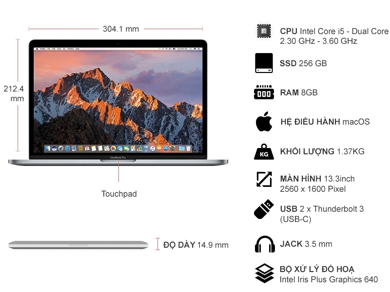Tích hợp bộ xử lý Intel Core i5, tốc độ 2.3GHz cùng dung lượng RAM 8GB, 256GB SSD lưu trữ cho những dữ liệu được xử lý nhanh chóng và mượt mà