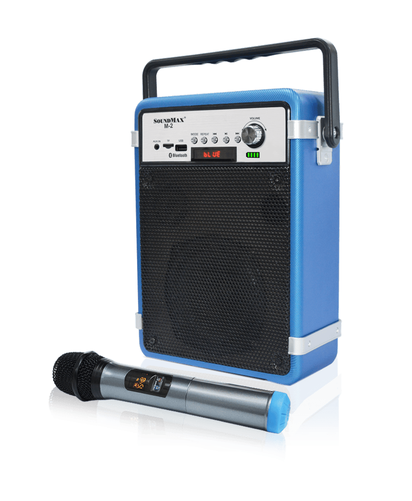 Loa vi tính Soundmax M2 màu xanh, có kích thước tương đương một chiếc cặp học sinh và cân nặng chỉ 2.6 kg, người sử dụng có nhu cầu di chuyển nhiều sẽ cảm thấy vô cùng dễ dàng, tiện lợi.Mặt trước lưới kim loại đẹp mắt.Các nút điều chỉnh âm lượng, echo của micro bố trí cho thao tác tiện lợi.Đèn LED nằm dưới nút tăng giảm âm lượng hiển thị mức pin hiện tại, giúp bạn kiểm soát được thời gian sử dụng của mình